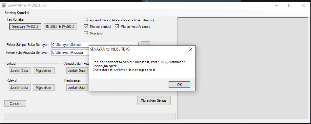 error itu umum banget ketika aplikasi migrasi (Senayan → INLISLite) memakai koneksi MySQL lama yang tidak mendukung charset utf8mb4.